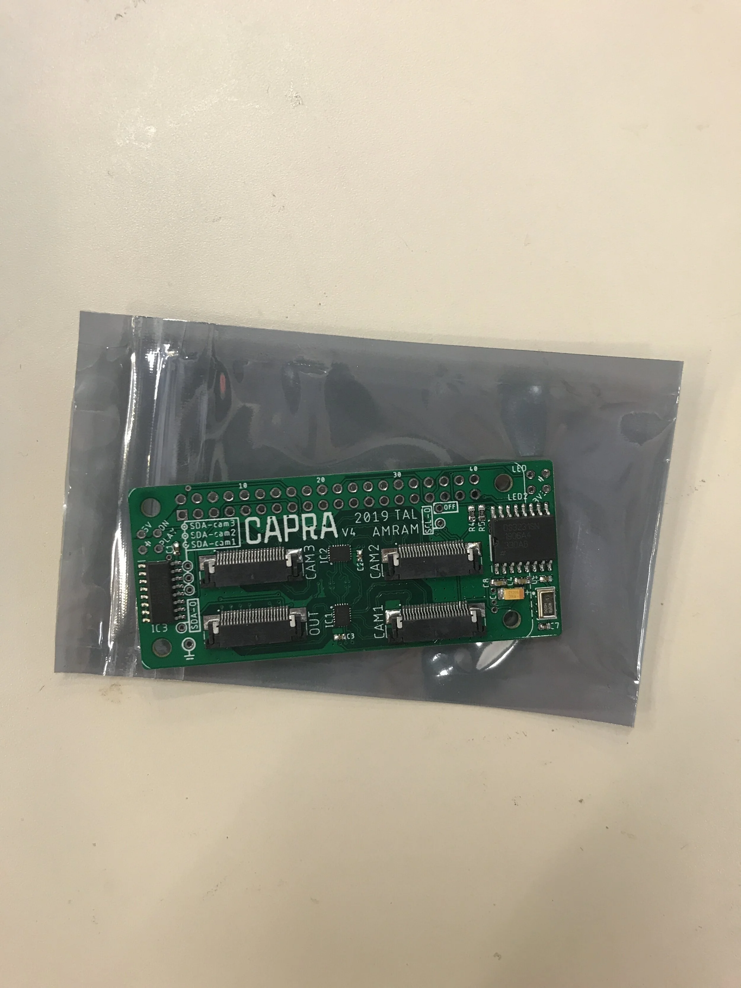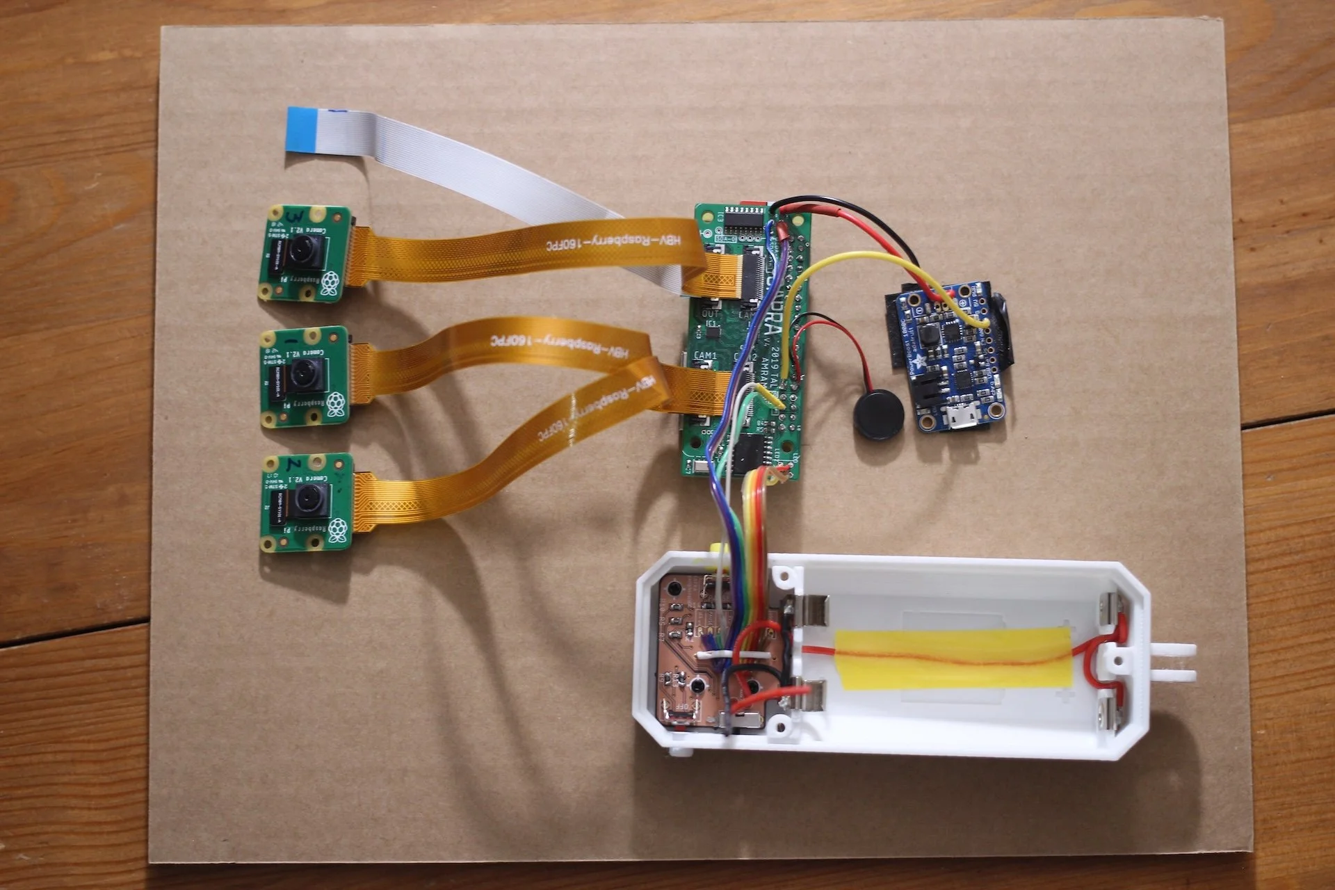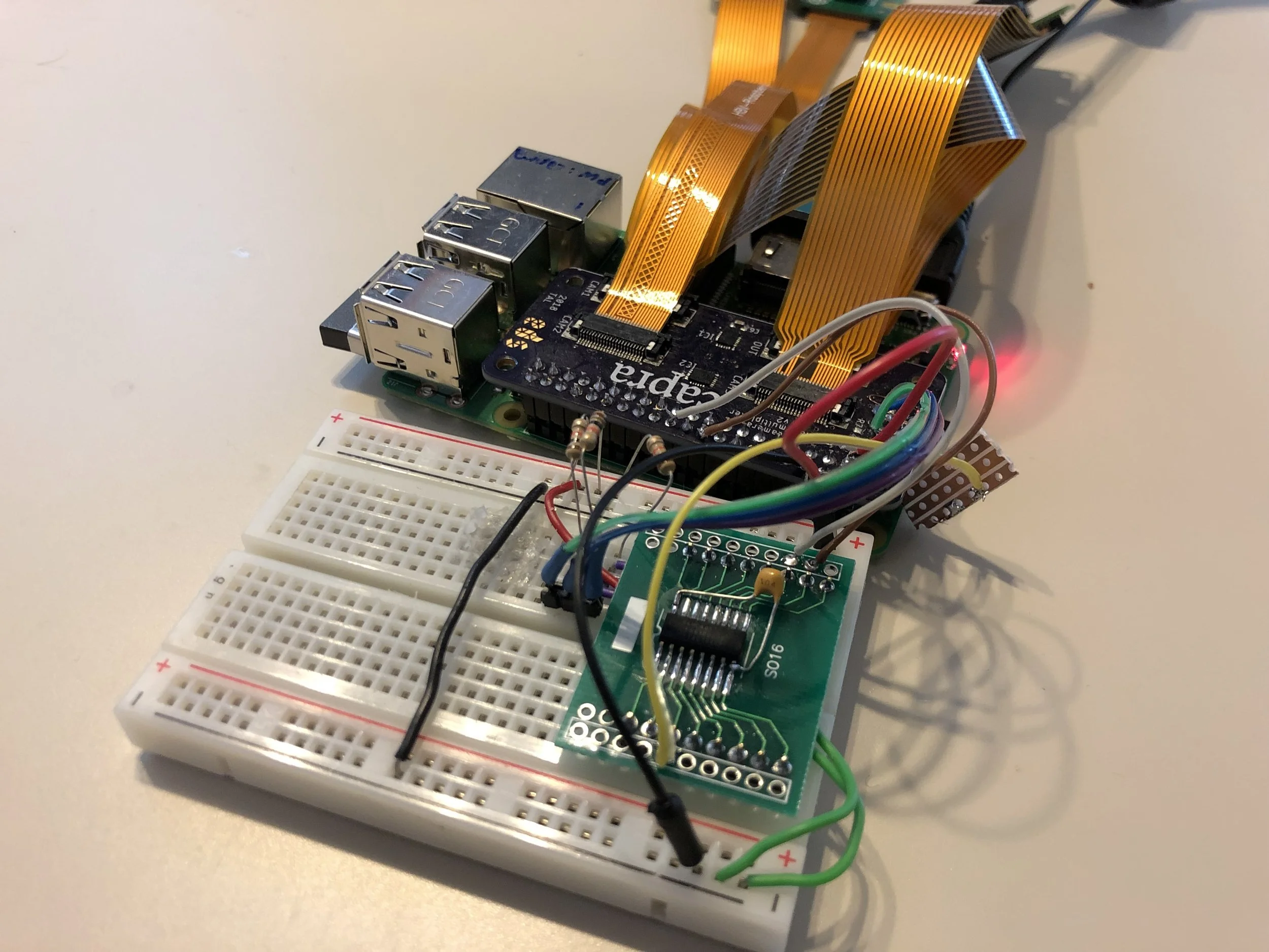 There was no commercially available board that could integrate multiple cameras to a Raspberry Pi Zero (particularly at a small form factor). In order to capture from 3 perspectives at once, my collaborator Tal designed a custom multiplexer.