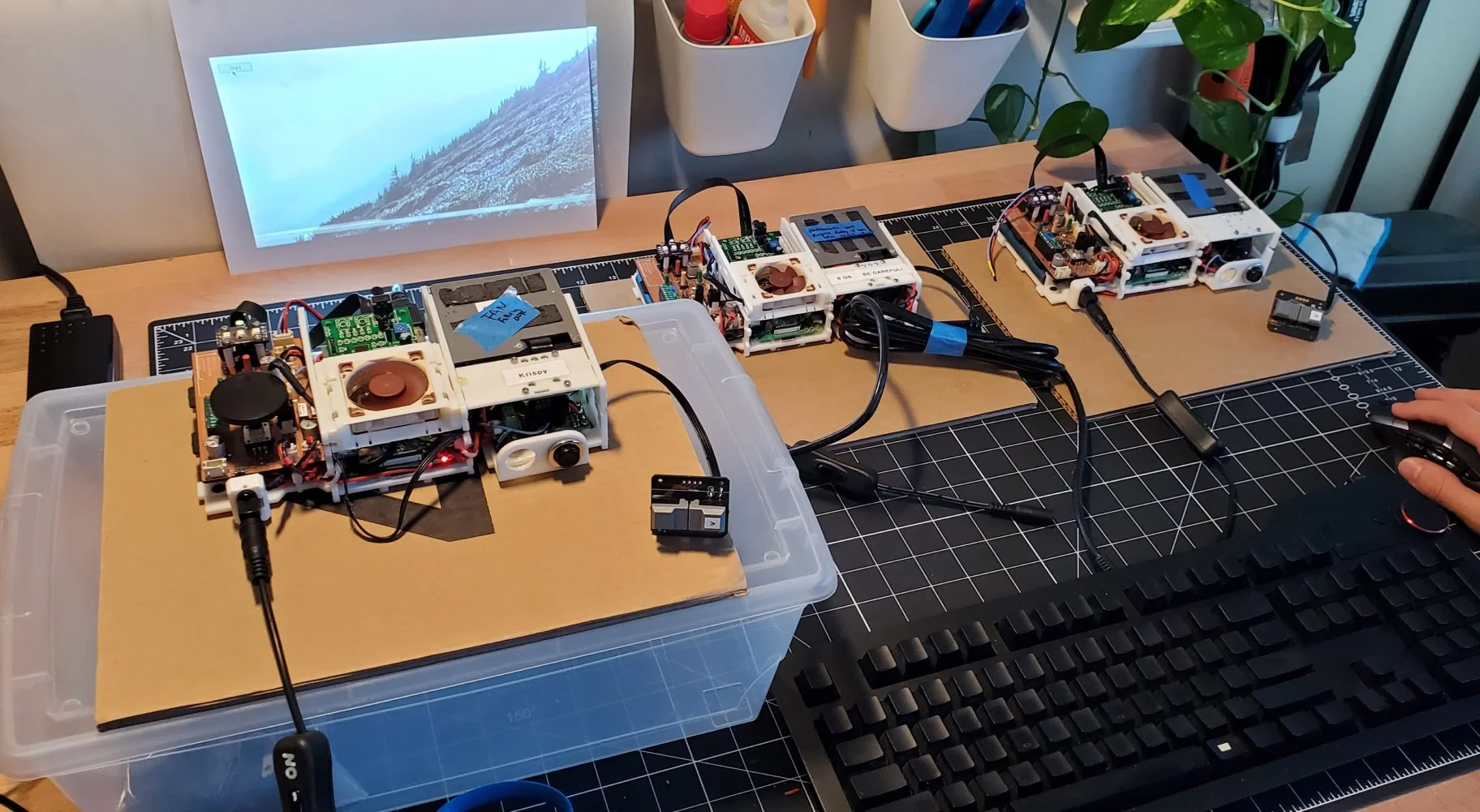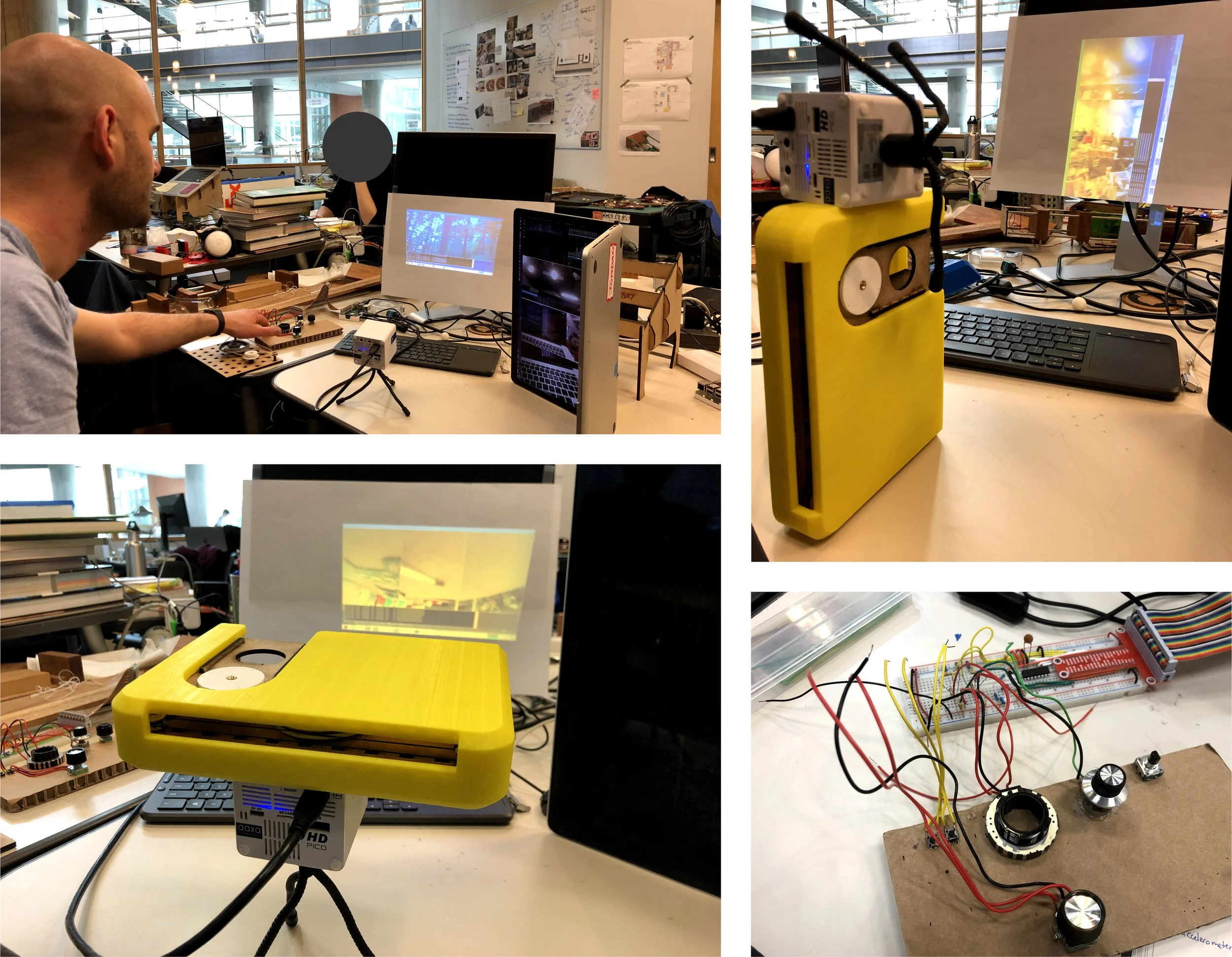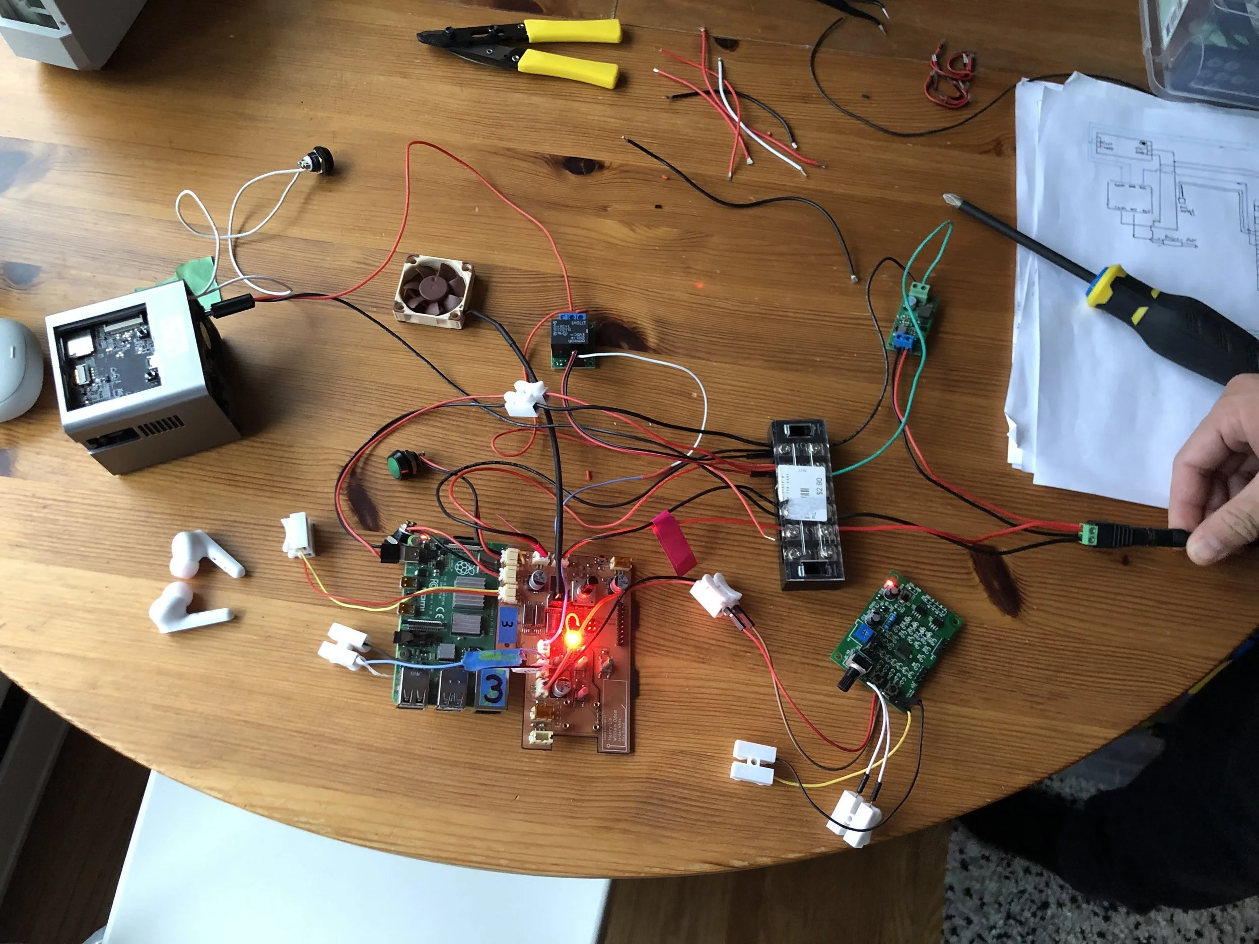 Henry and I spent a lot of long hours integrating the Raspberry Pi 4, custom control board, mini projector, fan, and power management.