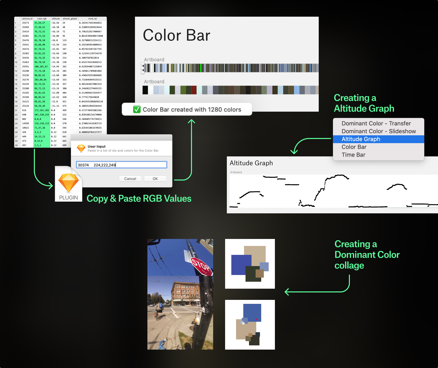 I solved this problem by developing a custom Sketch plugin. We could run a color or altitude query in SQLite, copy the results, then paste that into the Sketch plugin. The plugin instantly built the color bar, color collage, or altitude graph with up to 1280 data points from the database.