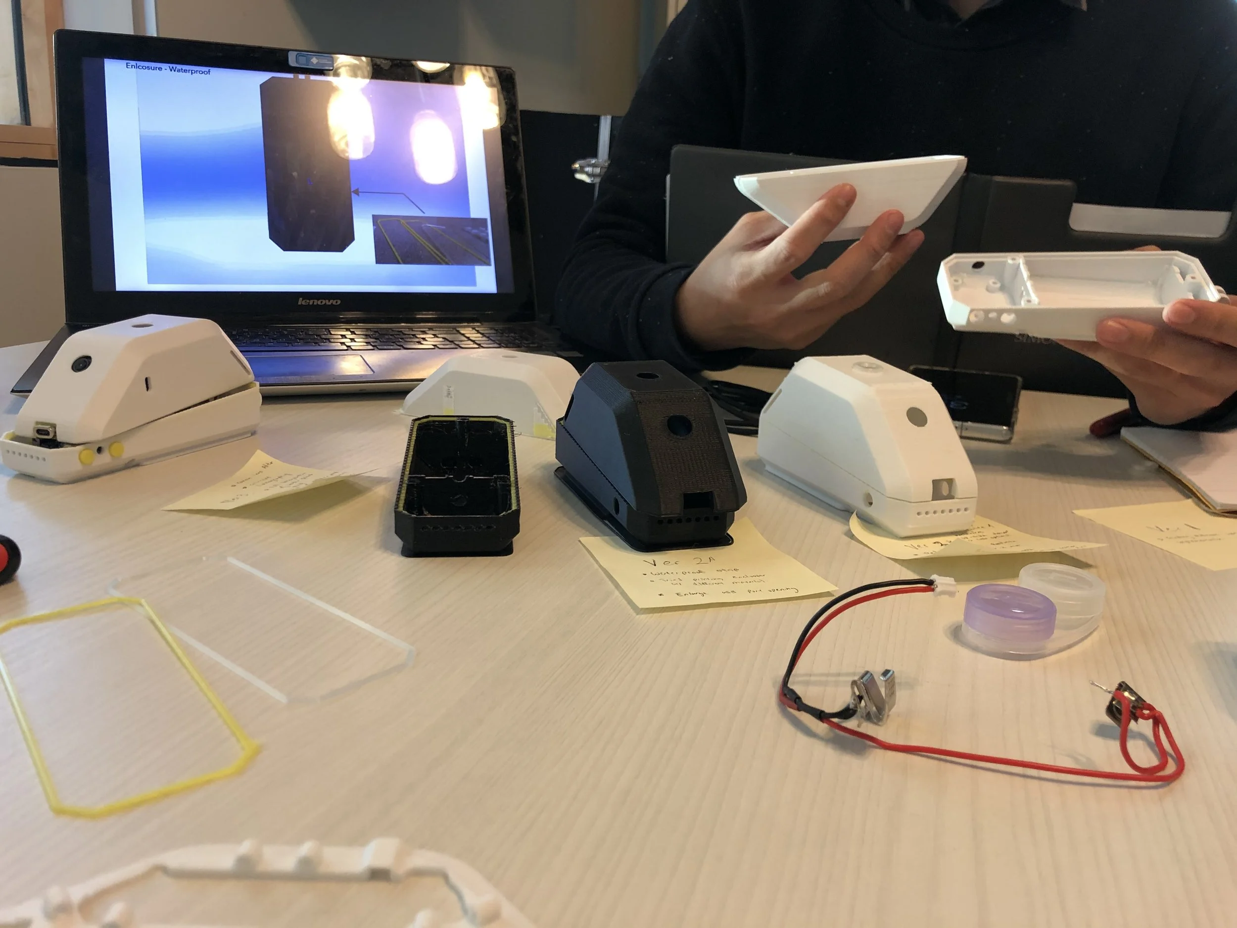 At this point in the design, we used a portable battery in a 3D printed holder to power the camera, had no lens covers, no weather proofing, and no GoPro connector.