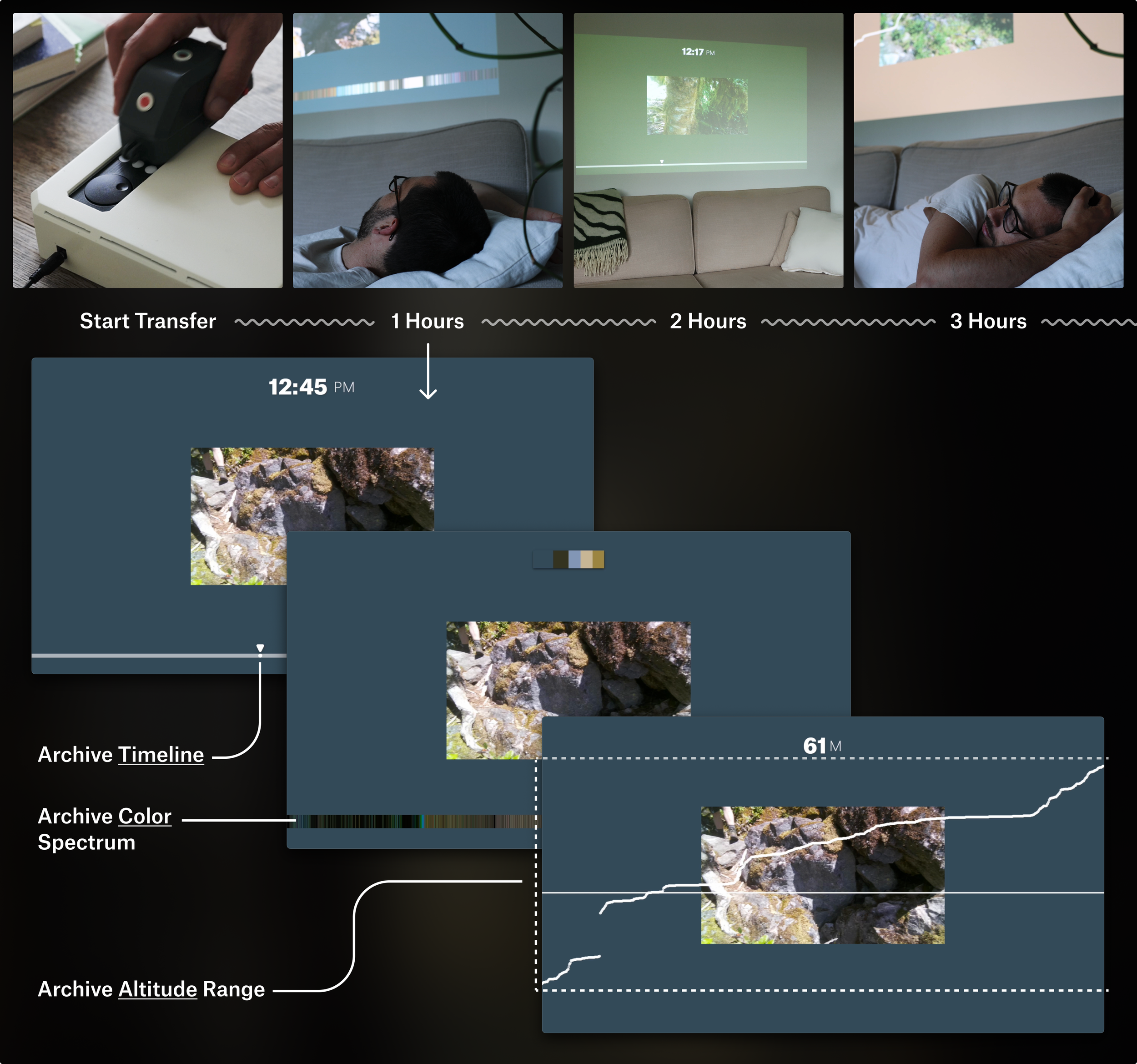 To Transfer a hike, the Collector is inserted into the Explorer. During this, the Explorer projects a slowly changing sequence of photos from the hike, showing how they fit within the existing archive.