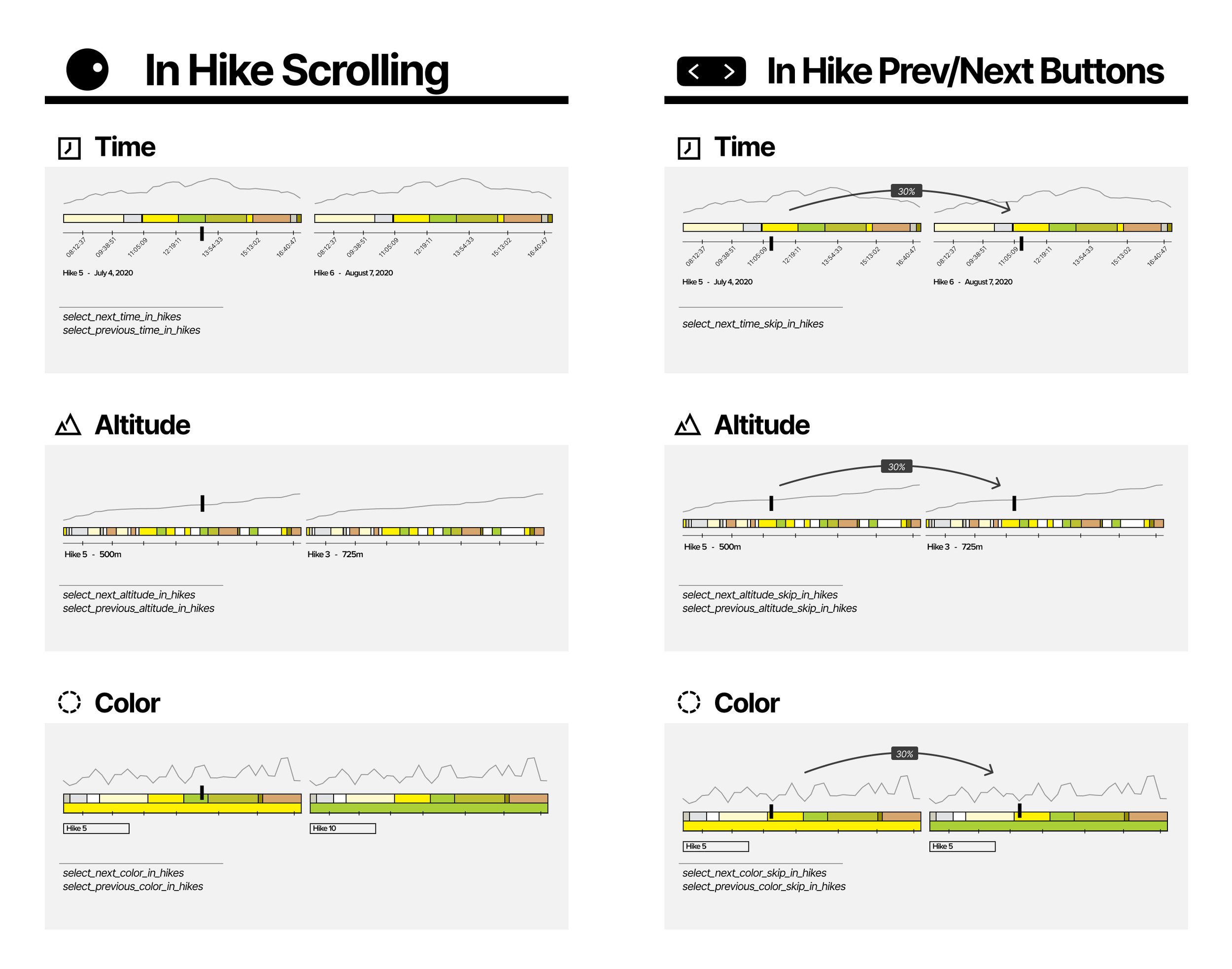 (Hikes, Archive) x (Time, Color, Altitude) x (prev hike, next hike) x (prev photo, next photo) = 24