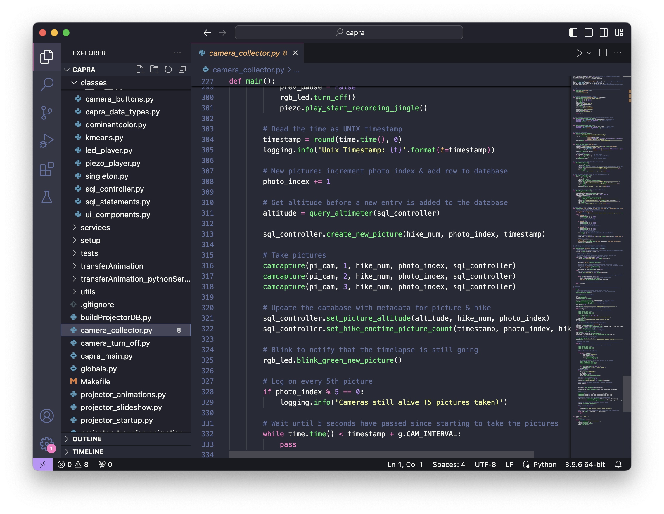 I wrote all the Collector software which reads from the 3 cameras, altimeter, RTC and saves to a SQLite database. It also controls the light and sound feedback when a user is starting, recording, pausing, and stopping a hike.
