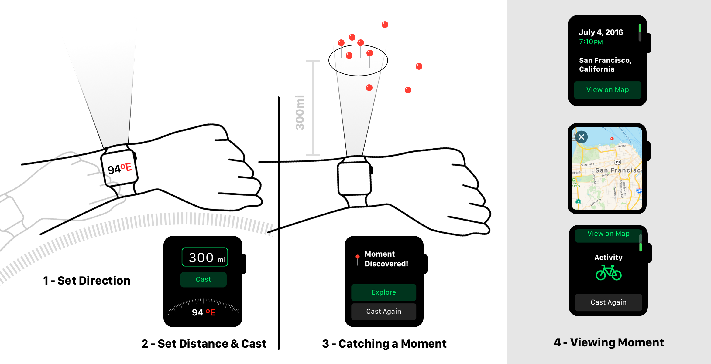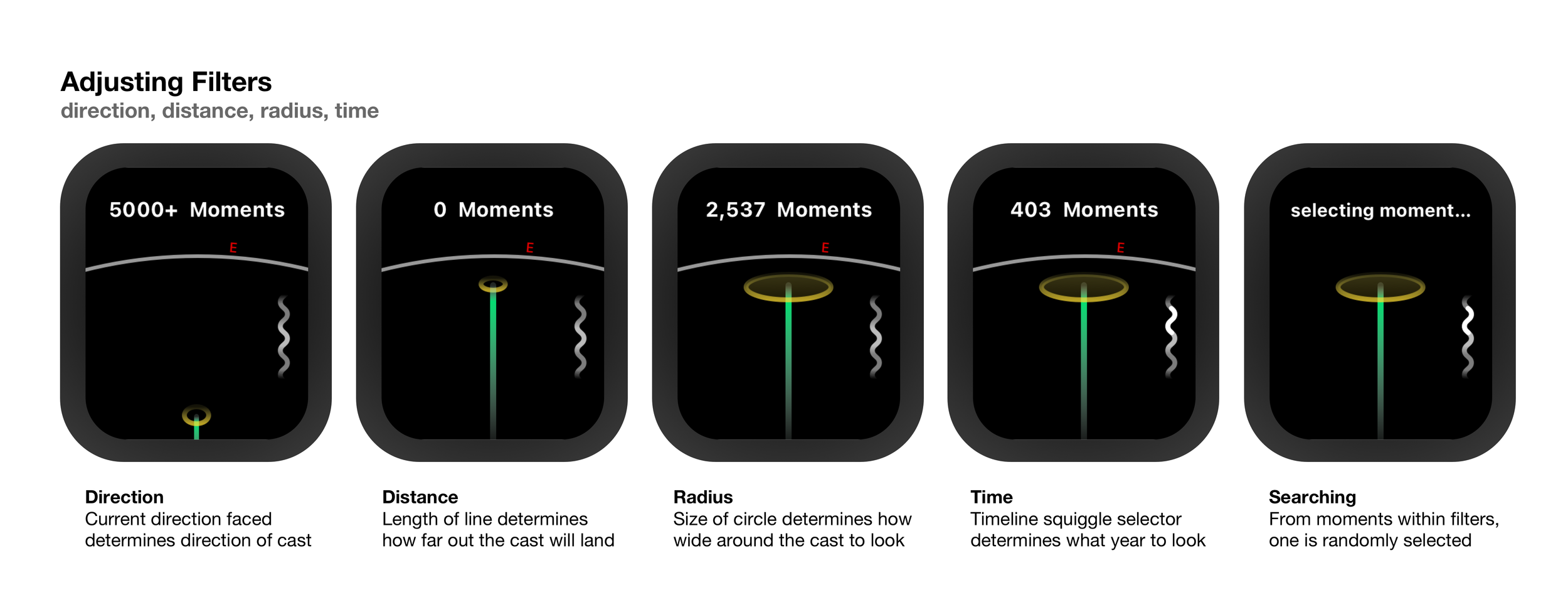 An Apple Watch app that lets you search for past location moments in a given direction and distance, pulling from your Google Maps Timeline.