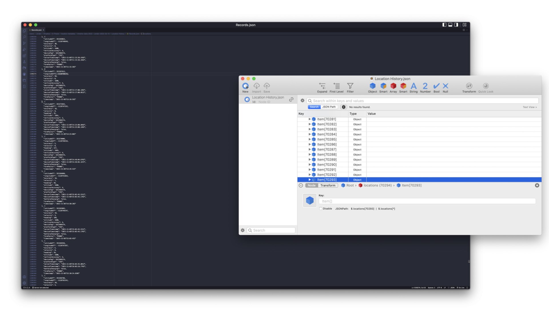 First, I imported my Google Timeline data (JSON) into a SQLite database.